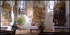 Hauptaltar: Hauptbild: Gnadenstuhldarstellung: Gottvater, Sohn, Hl. Geist als Taube auf Gottes Schulter. - Gott hält Christus trauernd auf dem Schoß, der schon in angedeuteter Auferstehungspose zu sehen ist.